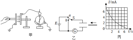 (2)“探究电容器充放电”的实验装置示意图如图乙所示,图中G为电流传感器,先将开关接a,待电容器充电后将开关扳到b,利用传感器记录电容器放电过程,得到该电容器放电过程的I-t图像如图丙所示,根据图像估算出电容器全部放电过程中释放的电荷量为 1.7×10-21.7×10-2C,已知电源电压保持为2V,则电容器的电容C=8.5×10-38.5×10-3F(结果均保留两位有效数字)。