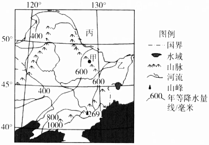 (2)“山环水绕”是东北地区的山河大势。图中甲处山脉是小兴安岭小兴安岭,陆上邻国丙是俄罗斯俄罗斯,该国与我国东北地区以黑龙江黑龙江(河流)为界。