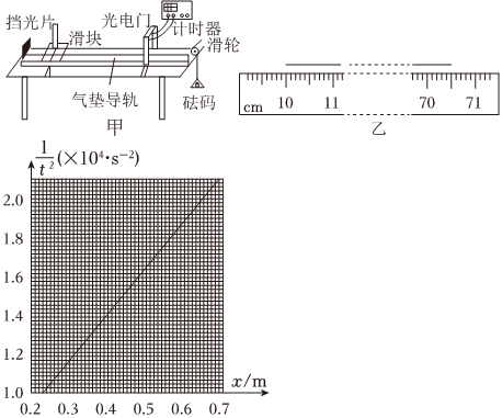 (2)根据实验测得的数据,以x为横坐标,1t2为纵坐标,在坐标纸中作出1t2-x图线如图(乙)所示,求得该图线的斜率k=2.38×1042.38×104m-1•s-2。已知挡光片的宽度d=6.60mm,由此进一步求得滑块的加速度a=0.5180.518m•s-2。(计算结果均保留3位有效数字)