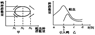 2020年2月,东非地区发生25年来最严重蝗灾,民众深陷缺粮窘境,治蝗问题备受关注。某地区曾做过一项实验,将大量的鸭子引入农田捕食水稻蝗虫,结果仅需2000只鸭就能把4000亩地里的蝗虫进行有效控制。为研究蝗虫种群数量变化规律,该实验还建立了如图所示的两个模型甲、乙,据图回答下列问题。