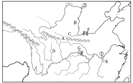 (2)长江中、下游的分界点①是;黄河上、中游的分界点②是。