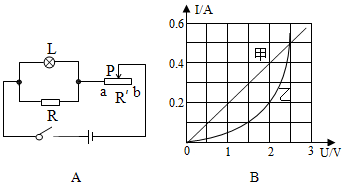 3.如图A所示,电源电压是3V,灯L与定值电阻R并联。图B是灯L和电阻R的电流随电压变化关系的图象,从图象看是灯L的图象(填“甲”或“乙”),电阻R的阻值是Ω.当灯两端的电压为2V时电路消耗的总功率为W。