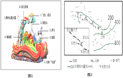 1.“交响丝路、如意甘肃”国庆彩车造型,运用丝绸之路、黄河风情、黄土高原、祁连风光等甘肃元素,表现出冰川、沙漠、草原、丹霞等甘肃特有的自然风光。读甘肃省彩车图(图1)和甘肃省略图(图2),完成下列问题。