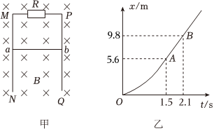 如左图所示,足够长的光滑平行金属导轨MN、PQ竖直放置,其宽度L=1m,一匀强磁场垂直穿过导轨平面,导轨的上端M与P之间连接阻值为R=0.40Ω的电阻,质量为m=0.01kg、电阻为r=0.30Ω的金属棒ab紧贴在导轨上。现使金属棒ab由静止开始下滑,下滑过程中ab始终保持水平,且与导轨接触良好,其下滑距离x与时间t的关系如图乙所示,图象中的OA段为曲线,AB段为直线,导轨电阻不计,g=10m/s2(忽略ab棒运动过程中对原磁场的影响),求:(1)ab棒1.5s-2.1s的速度大小及磁感应强度B的大小;