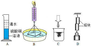图D:将两个铅柱底面削平、削干净,然后紧紧地压在一起,两个铅柱就会结合起来,甚至下面吊一个重物都不能把它们拉开。