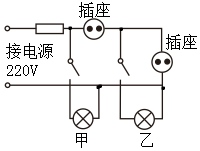 5.某同学在学习家庭电路时,安装了两盏额定电压均为220V的完好的白炽灯(甲和乙)和两个插座如图所示,如果两个插座均未连入家用电器,将电路的开关全部闭合,保险丝未熔断,那么各用电器工作的情况是( )组卷:781引用:6难度:0.9 -