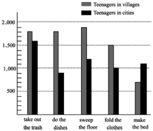 We can find out that teenagers in small villages do more chores than those in big cities.Maybe it is because they live a harder life.We will give our advice to parents in big cities.We think parents should give their children some chores to do because it's a good chance for teenagers to learn how to take care of themselves.