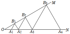 16.如图,已知∠MON=30°,点A1,A2,A3,…在射线ON上,点B1,B2,B3,…在射线OM上,△A1B1A2,△A2B2A3,△A3B3A4,…均为等边三角形,若OA1=2,则△A2022B2022A2023的边长为 .组卷:690引用:13难度:0.6