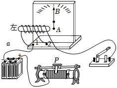 17.如图所示是小强研究“影响电磁铁磁性强弱因素”的装置图,它是由电源,滑动变阻器,开关、带铁芯的螺线管和自制的针式刻度板组成.通过观察指针B偏转角度的大小来判断电磁铁磁性的强弱,在指针下方固定一物体A,当用导线a与接线柱1相连,闭合开关后,指针B发生偏转。