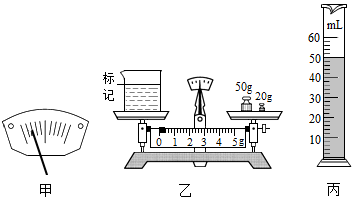 (3)小明在液面位置作上标记,将玻璃杯中的水倒入量筒,如图丙所示,读出水的体积V=cm3。