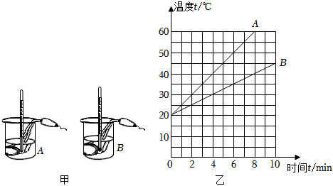 31.小龙用图甲所示装置探究“比较不同物质吸热的情况”,初温相同的A、B两种液体,分别装入相同烧杯中,用相同的电加热器加热,测得液体温度随时间变化的图象如图乙所示。