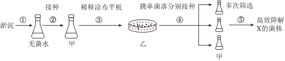 3.某种物质X(一种含有C、H、O、N的有机物)难以降解,会对环境造成污染,只有某些细菌能降解X。研究人员按照如图所示流程从淤泥中分离得到能高效降解X的细菌菌株。实验过程中需要甲、乙两种培养基,甲的组分为无机盐、水和X,乙的组分为无机盐、水、X和Y。下列相关叙述中错误的是( )