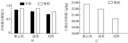 28.我国南方地区每年10月下旬到次年5月初是双季稻种植区的冬闲期。研究人员在冬闲期稻田中分别种植紫云英(豆科固氮植物)和油菜,紫云英盛花期全株翻耕还田、油菜籽粒收获后秸秆切碎还田。图甲是在早稻、晚稻成熟期进行土壤取样,并测的土壤微生物分解有机碳能力的相对值,图乙是晚稻收获后测得的土壤有机碳总量。下列相关叙述错误的是( )