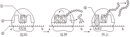 5.翻译的三个阶段如图所示,①~④表示参与翻译的物质或结构,其中④是一种能够识别终止密码子并引起肽链释放的蛋白质。据图分析,下列叙述错误的是( )