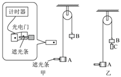 (1)该同学用游标卡尺测量遮光片的宽度d,然后将质量均为m(A的含挡光片和挂钩、B的含挂钩)的重物用绳连接后,跨放在定滑轮上,A置于桌面上处于静止状态,如图甲所示,测量出 。