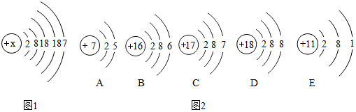 (1)x的值是,该原子在化学反应中容易电子,形成离子,离子符号为,它与图2中E所表示的元素形成的离子化合物的化学式为