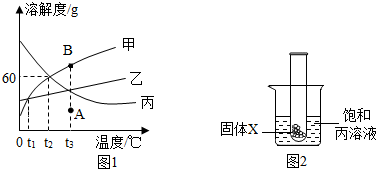 (4)如图2、将放有固体X的试管放入烧杯中,然后向试管内加入液体Y,一段时间后丙溶液中有固体析出,则对应的X和Y物质是。(填序号)