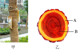 47.我们经常会看到有些植物在“输液”,如图甲所示。通过输液可以防治树木体内的害虫,或为根补充营养等。乙是茎的剖面图。