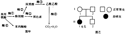 (1)苯丙酮尿症表现为苯丙酮酸的大量积累,可阻碍脑的发育,造成智力低下。据图甲分析可知,苯丙酮尿症的形成是缺乏酶(填图甲中序号)所致;酶⑤缺乏会引起病。从以上代谢途径可以看出,基因可通过,进而控制生物体的性状。