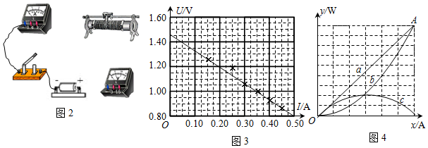 ⑤根据实验测得的I、U数据。若令y=IU,x=I,则由计算机拟合得出的y-x图线应是图4中的 (选填“a”、“b”或“c”)。其余两条图线分别是令y=IE和y=I2r得出的。根据前面测量得到的电源电动势和内阻的值,推测图4中A点的x、y坐标分别为一 A、W(保留2位有效数字)。