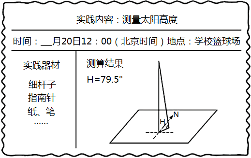 1.南通某中学(32.5°N,120.5°E)可立杆测影的方法开展了测量太阳高度角的地理实践活动。图为“某小组的实践记录单”。据此完成下面小题。