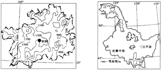 材料二:如图为贵州省和黑龙江省地形示意图贵州 黑龙江 全年多阴雨