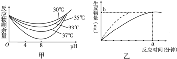 5.下图甲表示某反应物剩余量随pH及温度的变化情况,乙表示在最适温度和pH下,淀粉酶分解淀粉产生的生成物量随时间的变化曲线.下列叙述正确的是( )
