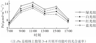 33.研究人员探究光质对苗期生姜叶片利用及光合特征的影响,以莱芜大姜为试验材料,创造光强相同而光质不同的环境条件,测定叶片光合速率日变化,如图所示,请据图回答: