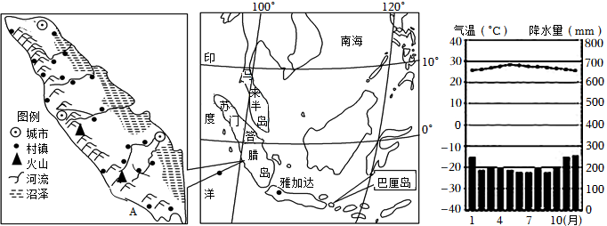 (4)归纳苏门答腊岛上城市、村镇分布特点,分析形成这种分布特点的原因是。 (一条即可)