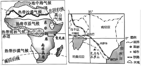 2.非洲是“一带一路”国际合作的重要组成部分。2019年,中国帮助肯尼亚修建的蒙内铁路(蒙巴萨——内罗毕)和内马铁路(内罗毕——马拉巴)正式通车,使东非地区货运成本大幅下降,运输时间大大缩短,方便了农产品的出口。如图为非洲气候分布图及蒙内和内马铁路线分布。据此完成1~5题。