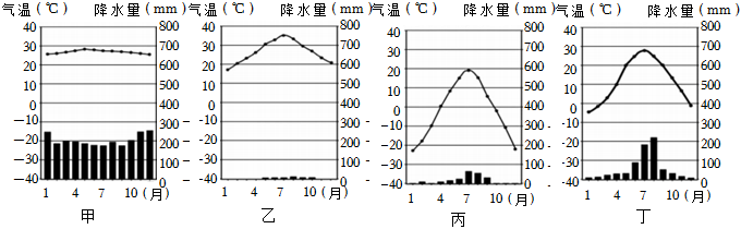 8.读图“甲、乙、丙、丁四地年气温曲线和降水量柱状图”,完成11~12题。