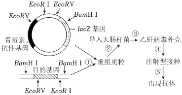 (2)图为“乙肝基因工程疫苗”的生产和使用过程,质粒中lacZ基因可使细菌利用加入培养基的物质X-gal,从而使菌落显现出蓝色,若无该基因,菌落则成白色。图中过程①有两种限制酶选择方案,它们分别是或。为了使重组质粒中目的基因正常表达,还需要插入的序列有。