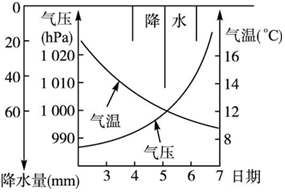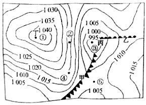 材料二,北半球近地面天气系统图(单位:hpa)。