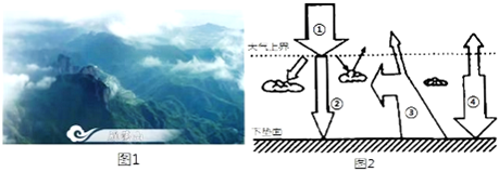 8.《航拍中国》是由中央电视台出品的纪录片。图1为纪录片中的雁荡山云海景观。图2为大气受热过程示意图。完成20~21题。