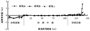 29.海岸沙席是一个较宽广平坦或微波起伏的风沙堆积地貌,按形态划分为沙席前缘、沙席中部及沙席后缘。平潭岛有典型的海岸沙席地貌,其后缘常见木麻黄防护林。当地夏秋台风多发,台风是海岸沙席地貌形成及演变的一个高能影响因子。如图为台风“麦德姆”登陆平潭岛后3条观测样线高程变化示意图,读图完成9~11题。